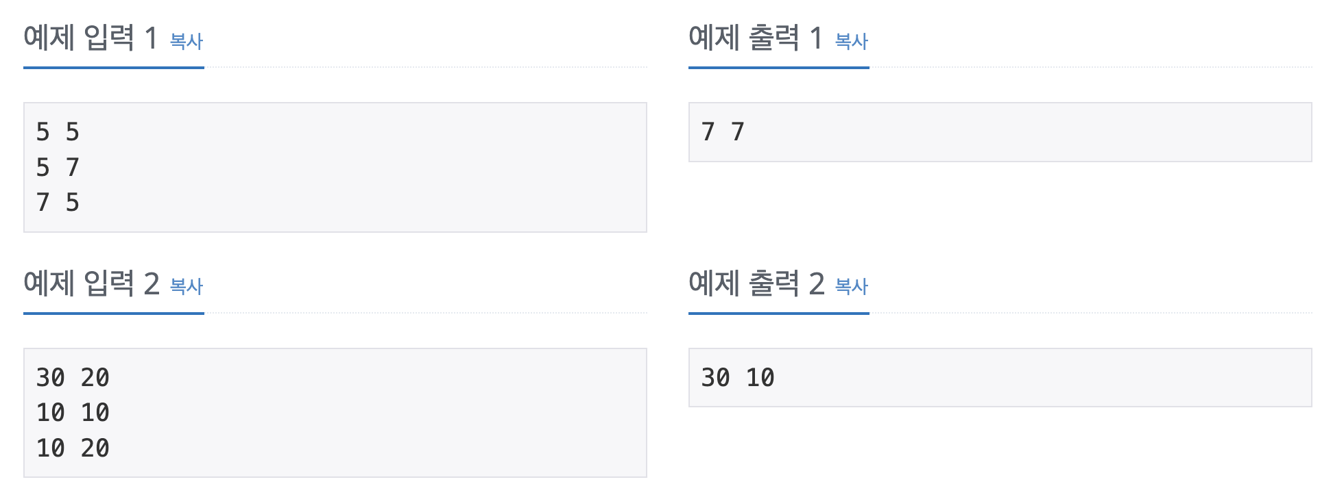 세 점이 주어졌을 때, 축에 평행한 직사각형을 만들기 위해서 필요한 네 번째 점을 찾는 프로그램을 작성하시오.